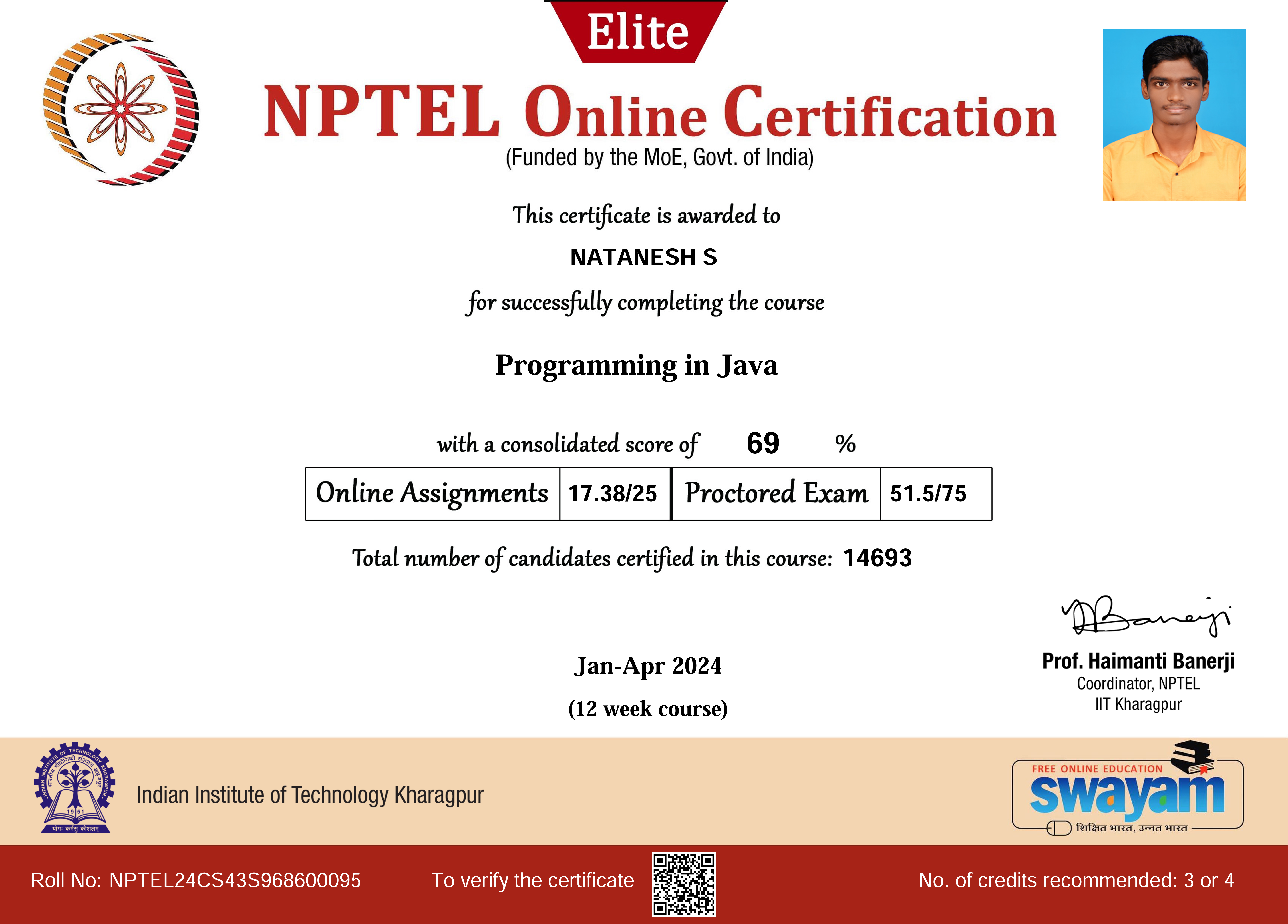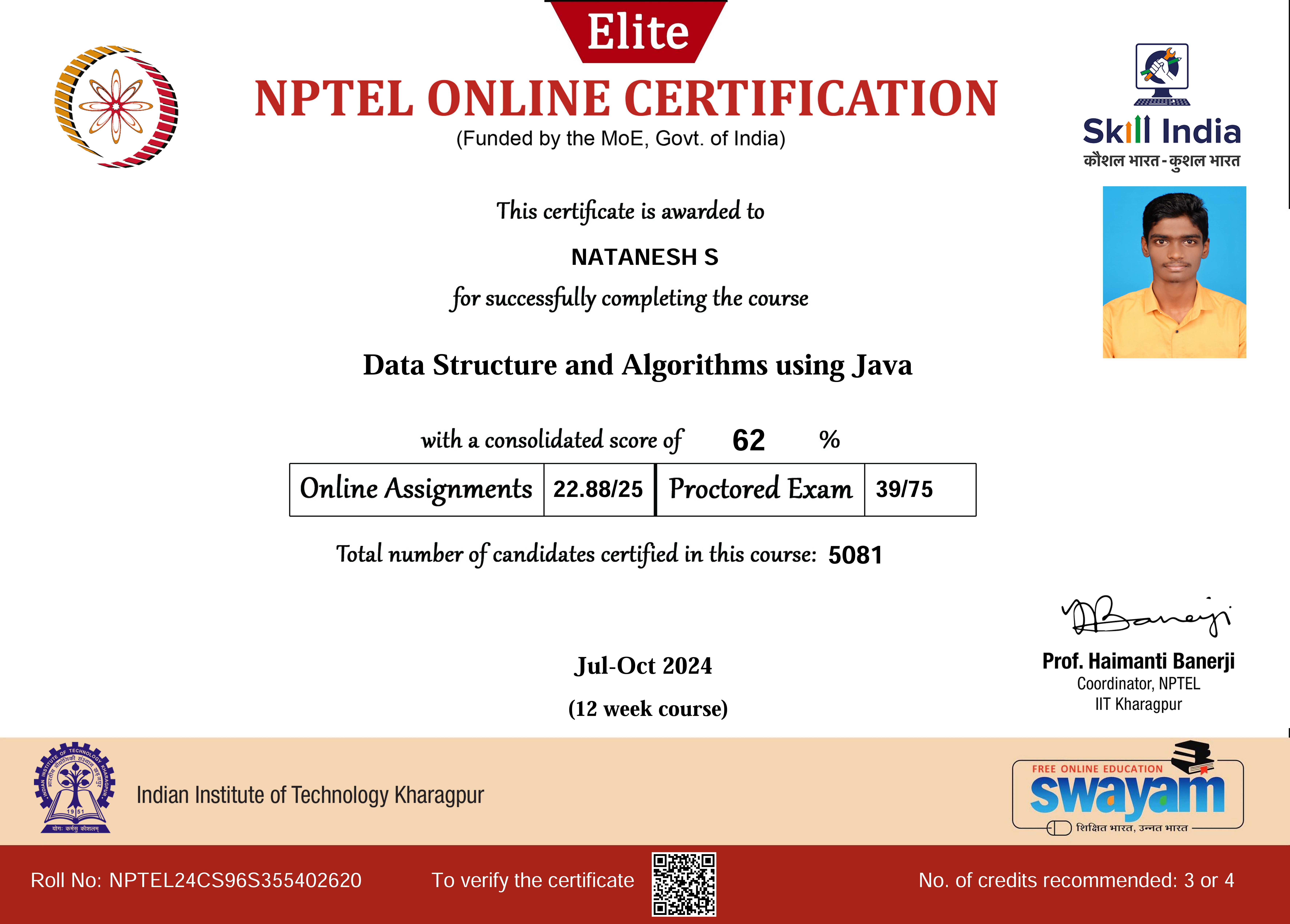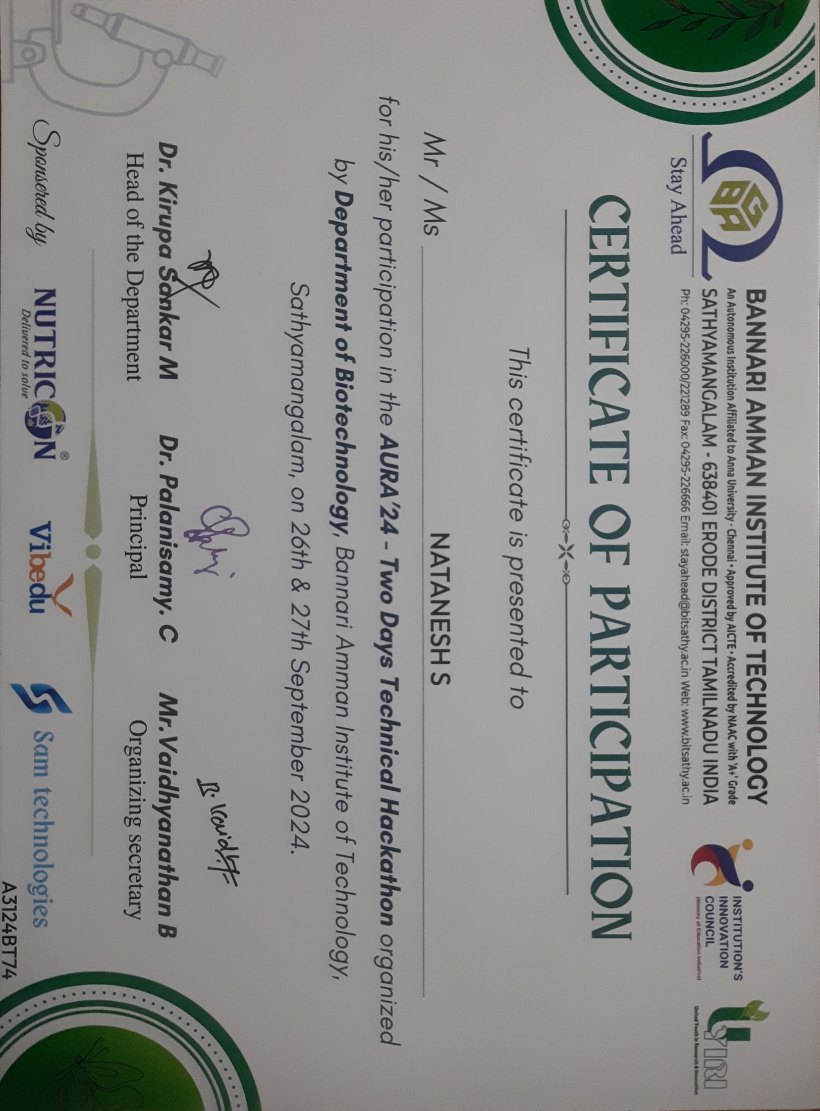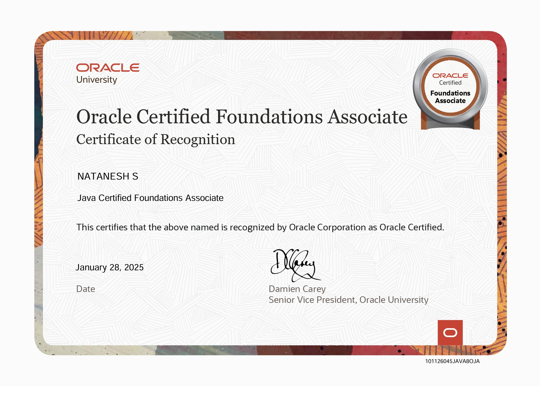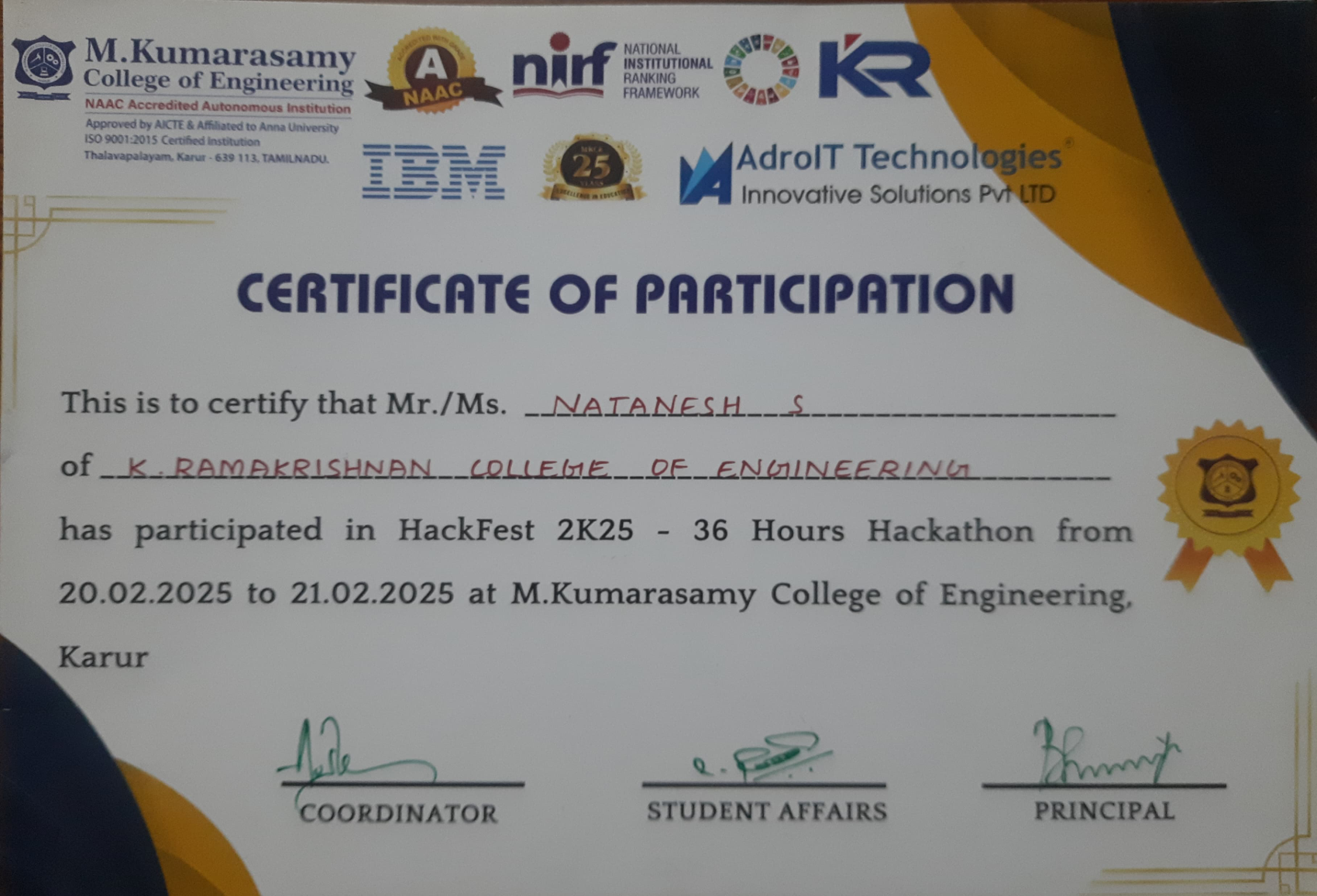 I’m Natanesh S , a Computer Science and Engineering student passionate about building impactful software solutions. From real-time chat apps to AI-powered medical platforms, I enjoy transforming ideas into practical applications using Java, Python, MySQL, and modern web technologies. I’ve also earned recognition in hackathons and hold a patent for my Ocean Guide Master project. Always curious and driven, I aim to grow as a versatile software engineer while creating solutions that make a difference.