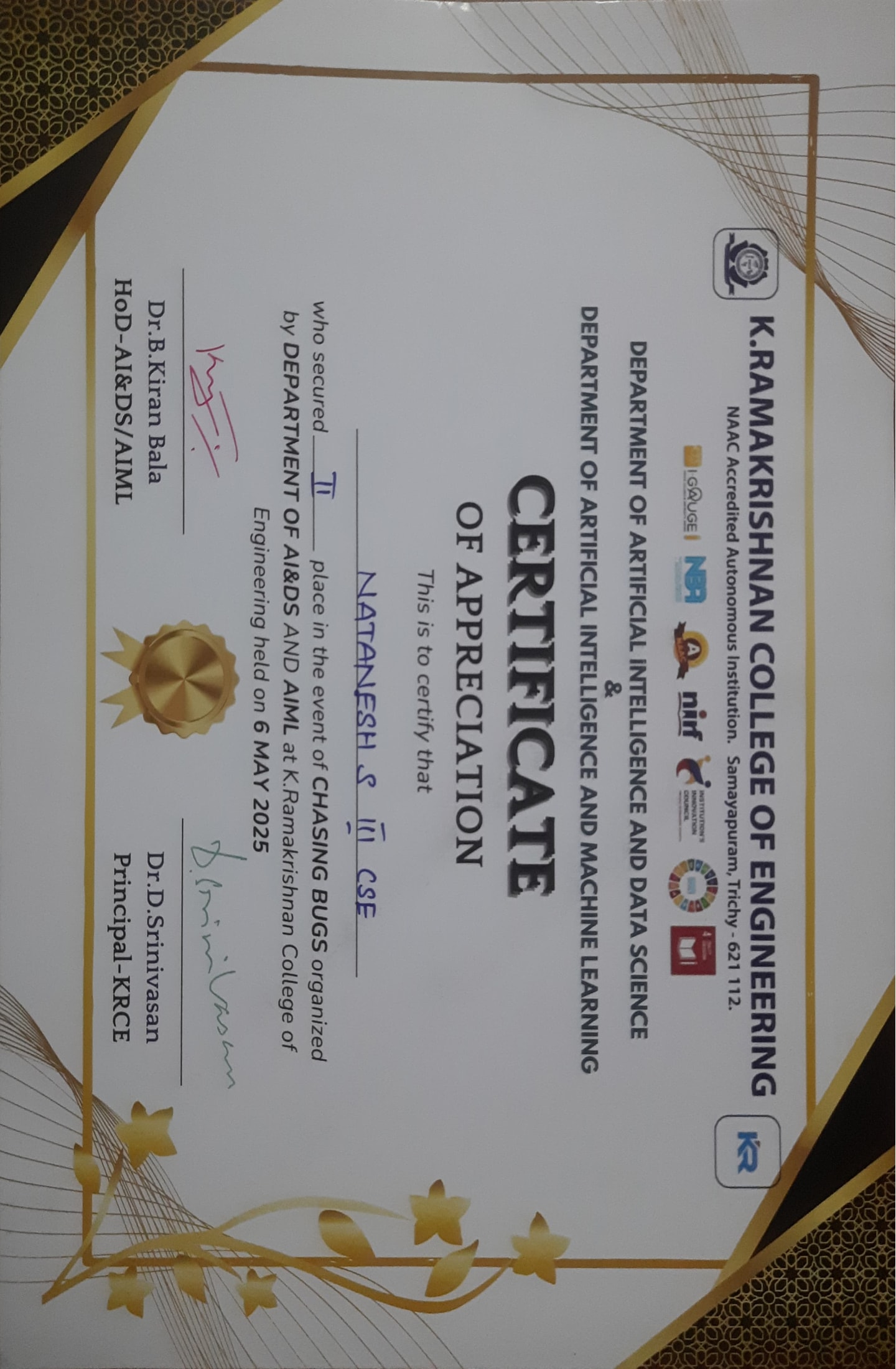 I won the 2nd prize in the “Chasing Bugs – 2025” Intra-College Debugging Contest at K.Ramakrishnan College of Engineering. This was a one-hour contest designed to test the accuracy and precision of programmers in debugging code. The challenge consisted of 40 questions — 20 in Java and 20 in Python — covering strings, arrays, and exceptions. Each question presented buggy code snippets, and we had to quickly identify and correct the errors by writing the fixes on the provided sheet. It was a true test of attention to detail, programming fundamentals, and problem-solving speed.