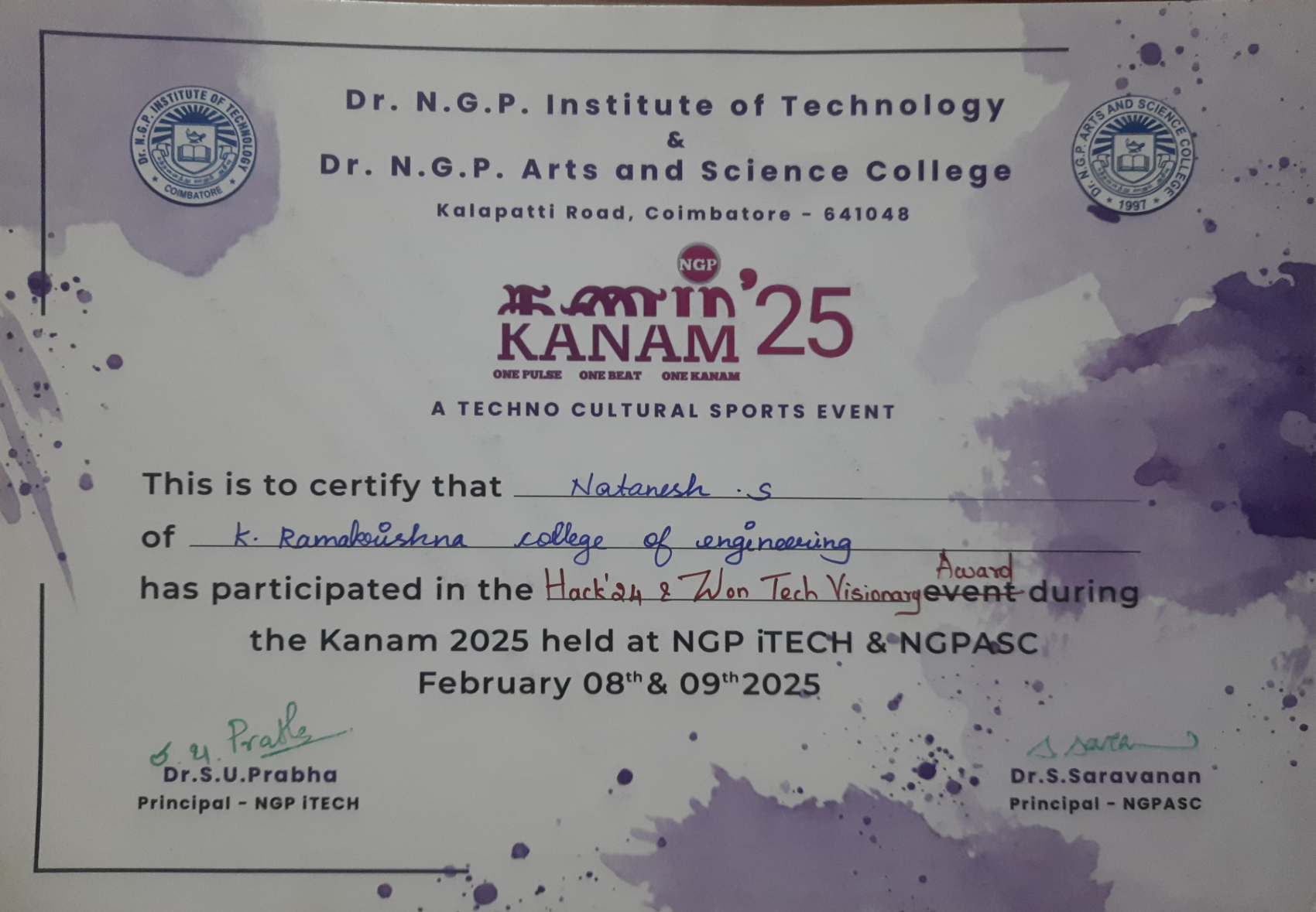 This achievement was truly special as it combined technical skills with social impact. Working alongside my teammates Roobis C, Udhayan P, and Kiruthik Roshan KS pushed us to innovate under pressure, collaborate effectively, and think beyond conventional solutions. Winning the 4th prize reinforced our belief that AI can transform healthcare delivery. I’m grateful to my mentors, peers, and the organizers of Hack24 for giving us this platform, and I look forward to applying these learnings in future projects that merge technology with real-world impact.