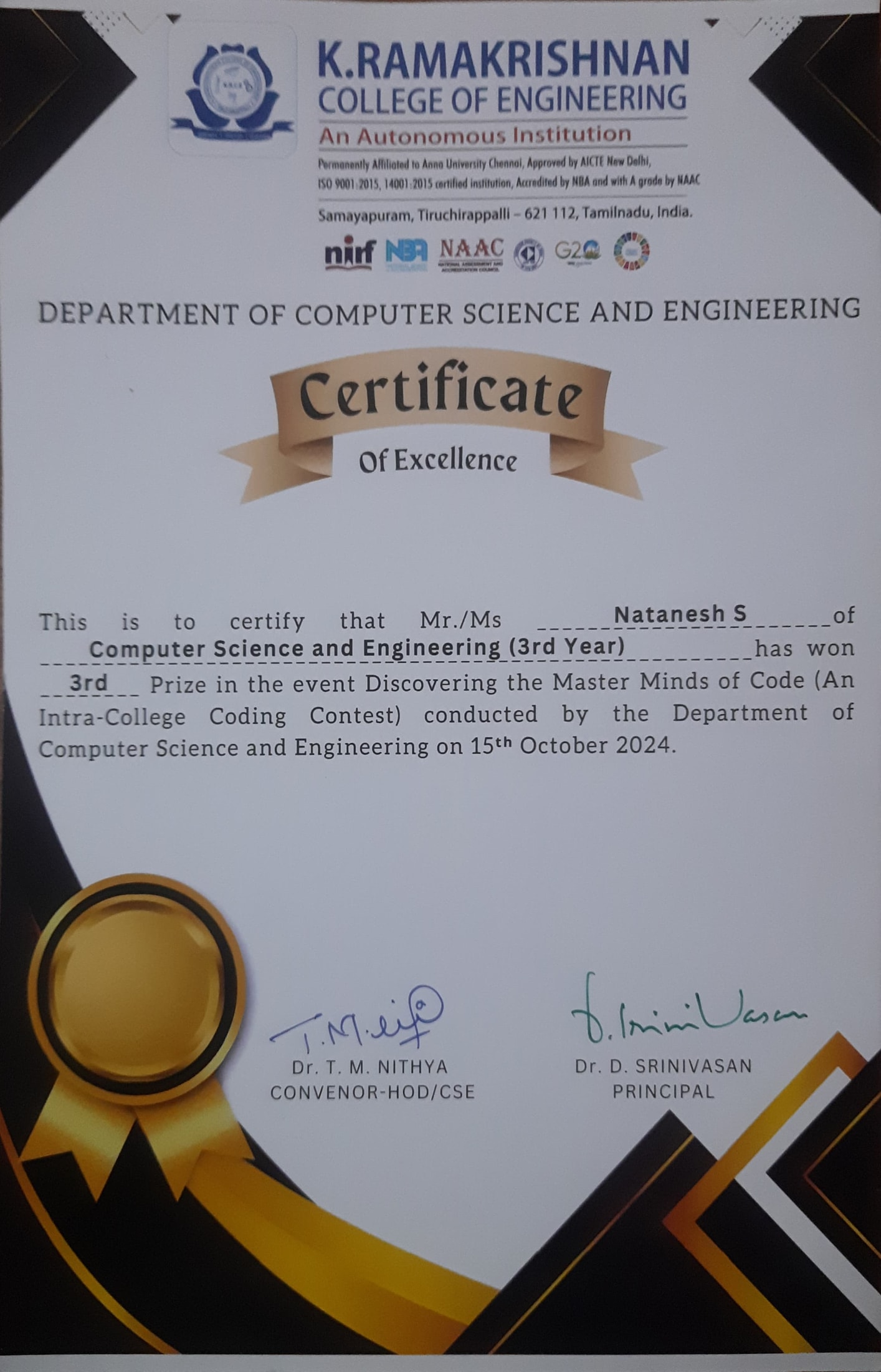 I secured the 3rd prize in the “Discovering the Master Minds of Code – 2024” Intra-College Coding Contest at K.Ramakrishnan College of Engineering. The competition tested our problem-solving abilities under intense time pressure, with just one hour to solve six algorithmic challenges. The problems included Majority Element, Merge Sorted Array, Substring Occurrence, Reverse Words in a String, Valid Parentheses, and Decode String. Each required not just coding knowledge, but also analytical thinking and time efficiency to implement the correct logic.